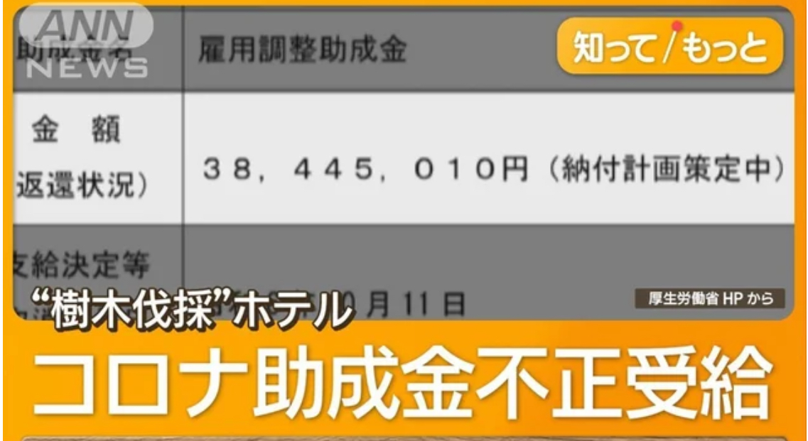 厚生労働省がホームページで公表したのは、「名人グループ株式会社」が休業を実施したことで支払われる雇用調整助成金約3800万円を、不正受給していた事実です。2021年1月から2022年11月まで「ホテルを休業した」と虚偽の申請をしていました。