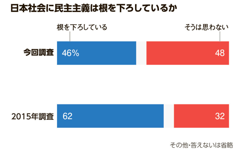 日本社会に民主主義が根を下ろしているかどうかについて、朝日新聞社が実施した全国世論調査(郵送)で聞いたところ、「根を下ろしている」は46%で、10年前の2015年調査の62%より大きく減った。「そうは思わない」と民主主義の定着に否定的な見方は、10年前は32%だったのが今回、48%に増えた。
