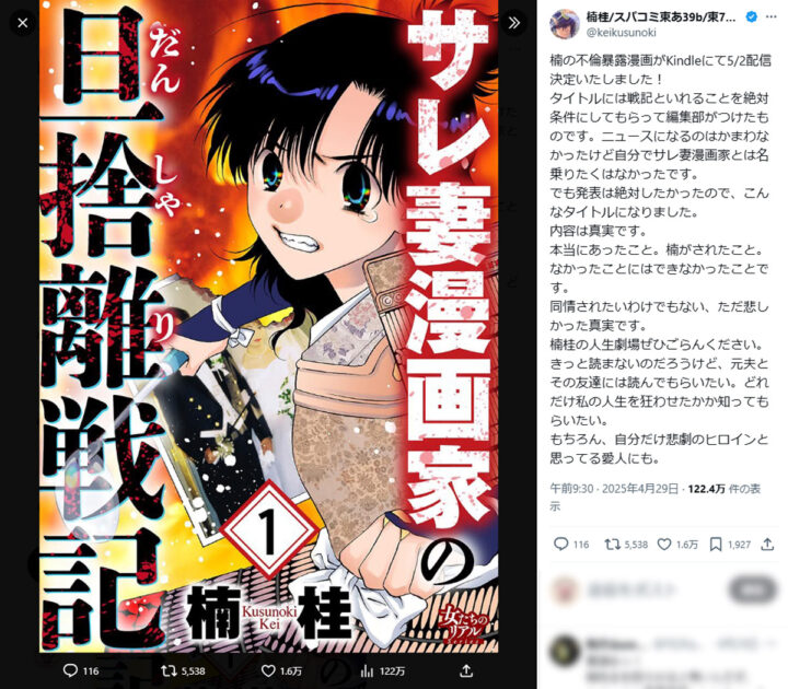 漫画「八神くんの家庭の事情」などで知られる漫画家・楠桂さんが、自身のXで告発していた夫の10年以上にわたる不倫について、その詳細を描いた実録マンガの連載を、5月2日よりAmazon Kindleにてスタートしました。