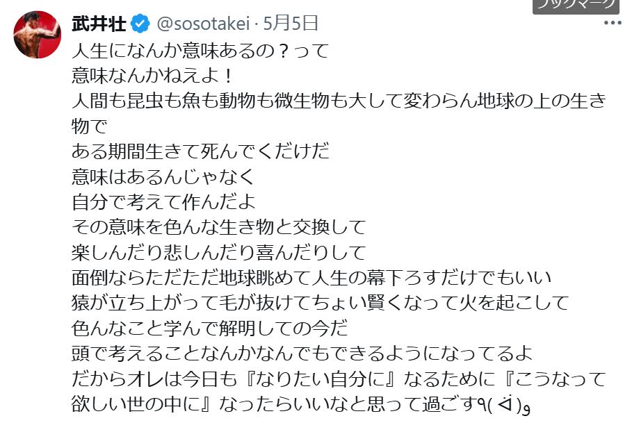 武井は「人生になんか意味あるの?って 意味なんかねえよ! 人間も昆虫も魚も動物も微生物も大して変わらん地球の上の生き物で ある期間生きて死んでくだけだ」と書き出した。