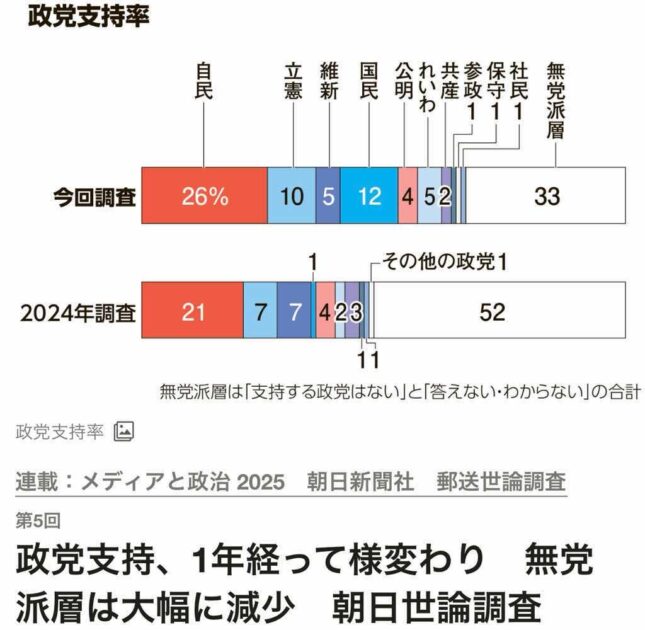 引用元: ・支持政党なし大幅減少 52%から33%に 国民が11%増加が原因 [659060378]