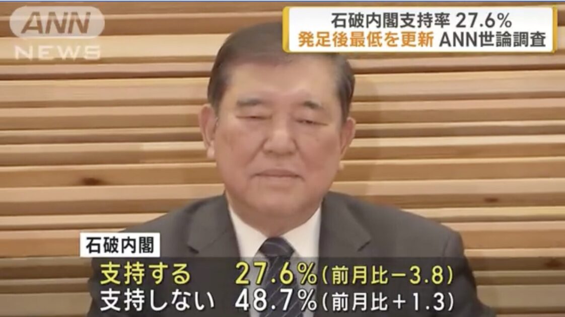 石破内閣の支持率が内閣発足後、最低の27.6%になったことがANNの世論調査で分かりました。ANNは10日、11日に世論調査を行いました。