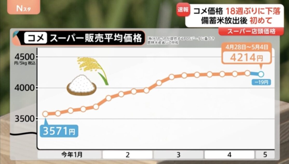 先ほど発表されたスーパーでのコメの平均価格は5キロあたり4214円と、18週ぶりに値下がりしました。農林水産省によりますと、先月28日から今月4日までに全国のスーパーで販売されたコメ5キロあたりの平均価格は前の週より19円下がって、4214円となりました。18週ぶりの値下がりです。