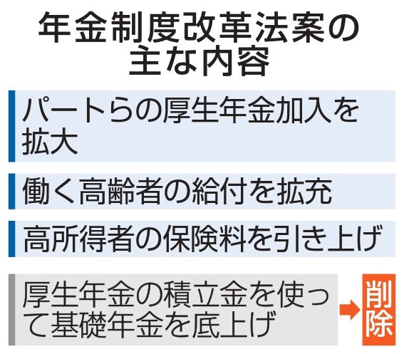 だが、厚生年金の積立金を活用することに労働団体などから懸念が示され、自民党内に「広く理解を得られない法案提出は避けたい」というムードが広がった。これを受け、厚生労働省は法案から国民年金の底上げ部分を削除するなど修正。党内で大筋の了承は得たものの、法案を今国会で審議・成立させることにはなお慎重な意見もある。