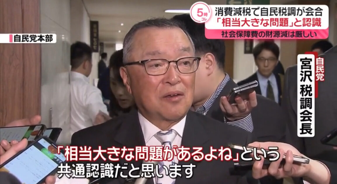会合後、宮沢税調会長は、消費税は社会保障費の財源になっていることを強調し、消費減税については「大変厳しい問題がある」との見解を示しました。