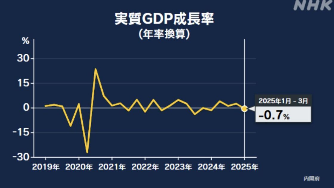 内閣府が発表した2025年1月から3月までのGDP=国内総生産は、前の3か月と比べた実質の伸び率が、年率に換算してマイナス0.7%で、4期ぶりにマイナスとなりました。全文はソースで 2025年5月16日 8時56分