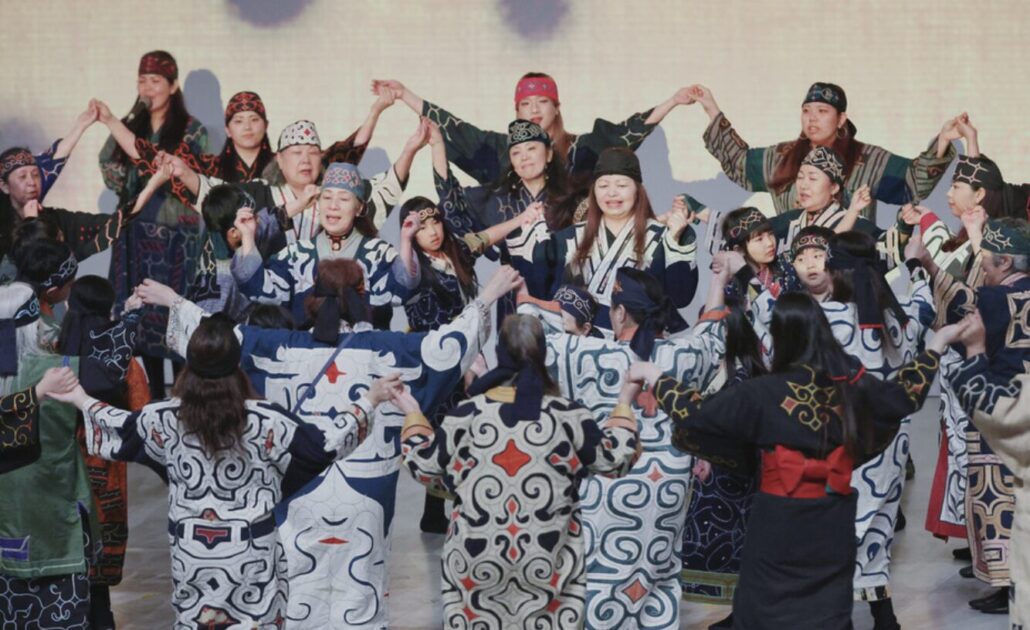 道央と道北地域に伝わる演目「イランカラプテ」(こんにちは)では、動植物や自然、道具などに宿るとされる神々「カムイ」へ祈りを捧げる踊りや、山で美しい鳥に出合った狩人の心象をうたった演目などが披露された。