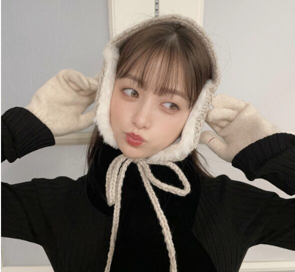 白いふわふわイヤマフラーがついたニットの帽子をかぶり、口をすぼめ、目線をそらしたポーズの一枚を披露しました。