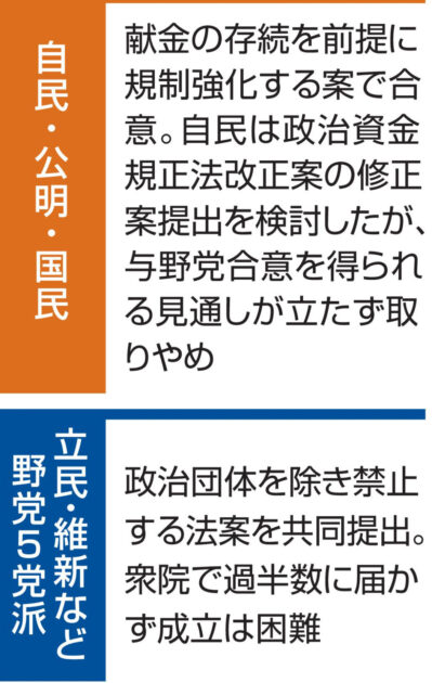 自民は、献金の透明性向上を目的とした規正法改正案を既に単独で国会提出。公明、国民民主の協力を得られれば衆院で過半数に達するため3党の合意事項を盛り込んだ修正案提出を検討していた。