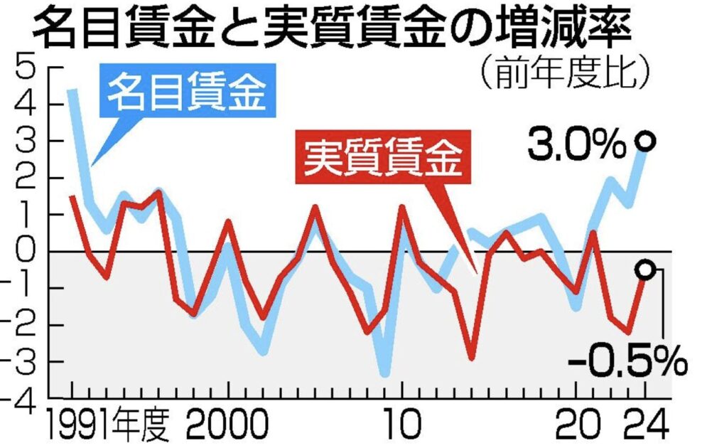 引用元: ・昨年度の実質賃金、0.5%減 3年連続マイナス―厚労省 [蚤の市★]