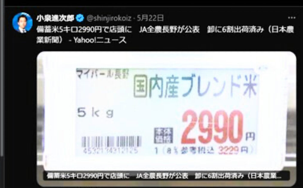 JA全農長野は23日、長野県内の農協系スーパーで備蓄米5キロが税抜き2990円で販売されていることを伝えた報道を小泉進次郎農林水産相が自身のXアカウントで引用したことを受け、「大臣就任により引き下げたのではない」とする異例の声明を出した。