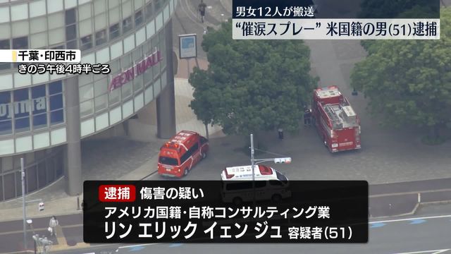 千葉県印西市の「イオンモール千葉ニュータウン」駐車場で催涙スプレーが噴射され、40人以上が目やのどの痛みを訴えた事件で、印西署は24日、男性2人に対する傷害容疑で米国籍の自称コンサルティング業、リン・エリック・イェン・ジュ容疑者(51)=同市=を逮捕した。 署などによると、男女44人が目やのどの痛みを訴え、うち12人が救急搬送された。いずれも命に別条はない。