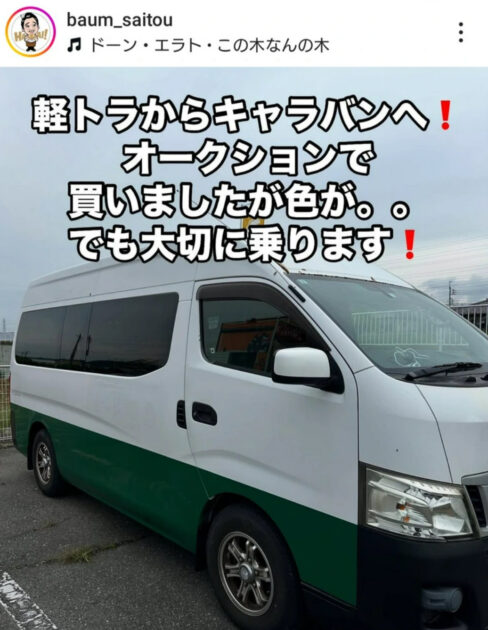 同アカウントでは、トヨタ『ハイエース』とともに、日本のワンボックスカーシーンをけん引してきた名車・日産『キャラバン』の写真とともに「軽トラからキャラバンへ!」と報告。
