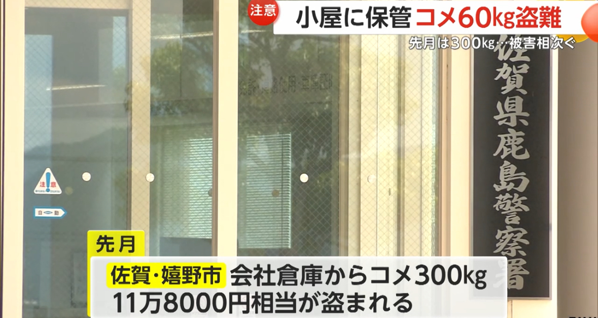 また4月には、佐賀・嬉野市で会社の倉庫に保管されていたコメ300kg、11万8000円相当が盗まれました。