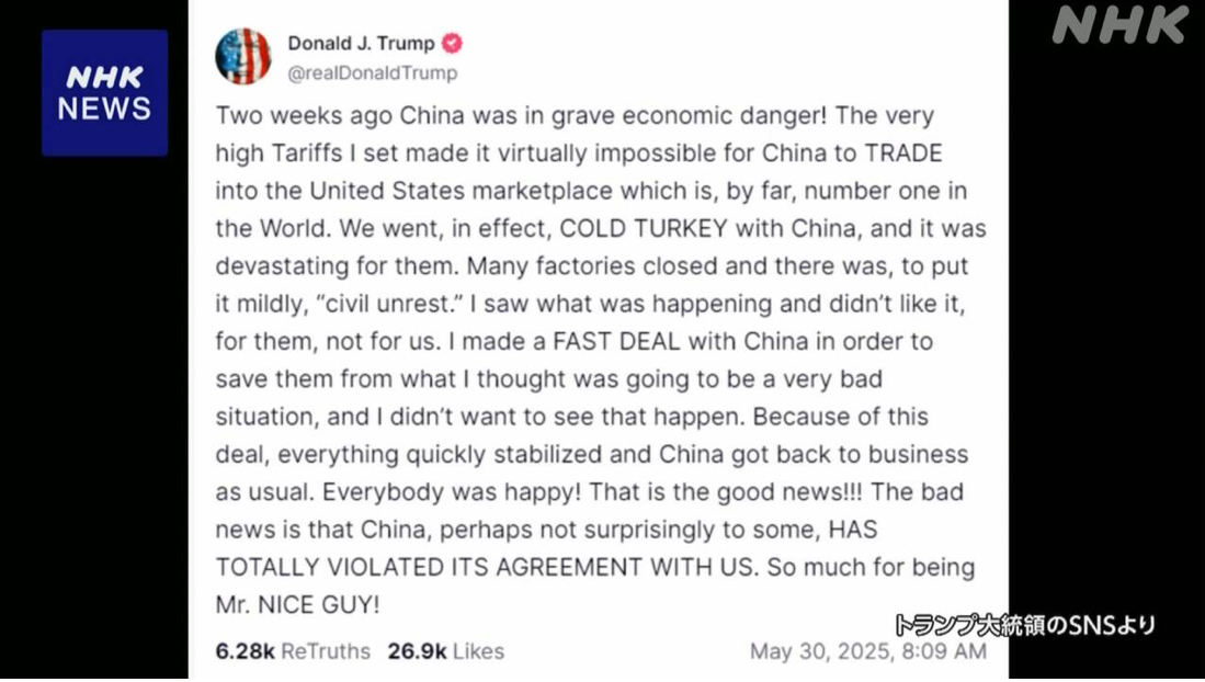 アメリカのトランプ大統領は中国との貿易協議をめぐりSNSに「中国はアメリカとの合意を破った」と投稿しました。中国の対応に不満を募らせているとみられ、貿易摩擦が再び激しくなることへの懸念も出ています。アメリカは、今月スイスで行われた中国との貿易協議の結果、互いに課している追加関税を115%引き下げることで合意し、そのうえで市場の開放や貿易赤字の削減を求めています。こうしたなかトランプ大統領は30日、自身のSNSに「非常に悪くなるかもしれない状況から中国を救うため私は中国と迅速な合意を結んだ。この合意により状況は急速に安定し、中国は通常の状態に戻った。みながハッピーでよいニュースだ」と投稿しました。