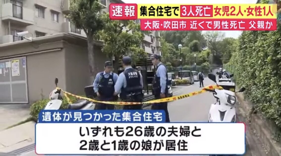 大阪府吹田市のマンション一室で2日午前、女児2人と女性1人の遺体が見つかった事件で、大阪府警吹田署は同日、3人はこの部屋に住む女性(26)と1歳と2歳の娘と判明したと明らかにした。同市内の別の場所で死亡した男性は、女性の夫(26)とも特定され、同署は夫が無理心中を図った可能性があるとみて詳しい状況を調べている。