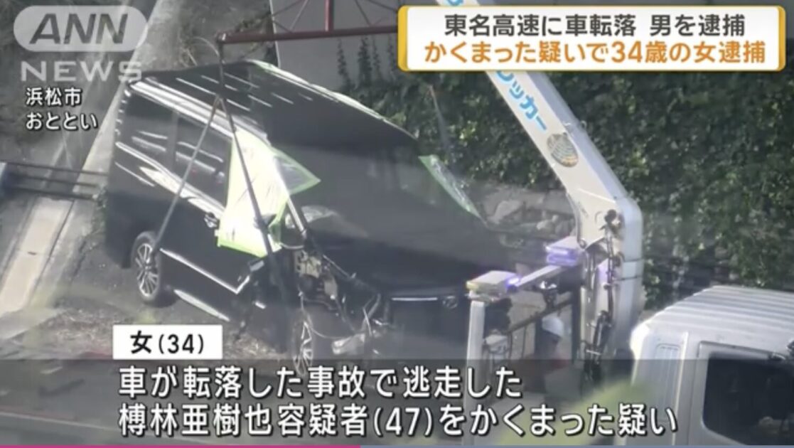 テレ朝news 東名高速の路側帯に乗用車が落下した事故で、無免許運転の疑いなどで逮捕された男をかくまっていたとして34歳の女が逮捕されました。