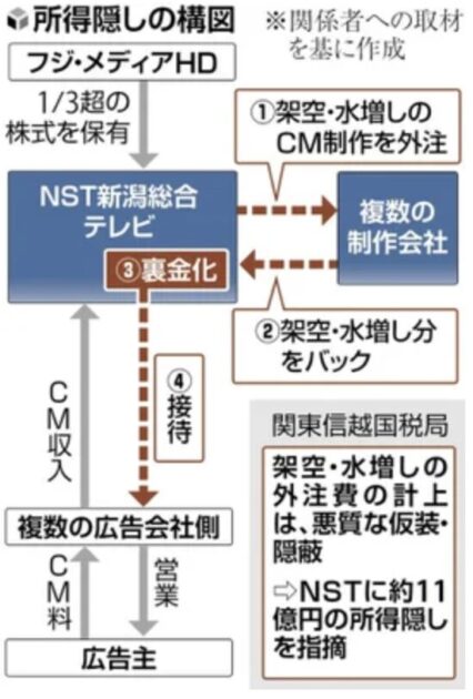フジテレビ系列の「NST新潟総合テレビ」(新潟市中央区)が、関東信越国税局から2024年3月期までの6年間で、計約11億円の所得隠しを指摘されていたことが関係者の話でわかった。同国税局は、NSTが実際にはCMを作っていないにもかかわらず、CM制作費として架空の経費を計上するなどしていたと認定。重加算税を含め法人税計約4億円を追徴課税したとみられる。