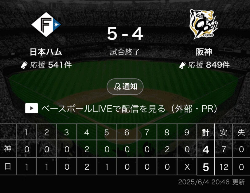 引用元: ・【野球】交流戦 F 5-4 T [6/4] 日本ハム逃げ切り勝ち 郡司先制打、万波11号、山縣2ランプロ初HR 阪神連勝ストップ [鉄チーズ烏★]