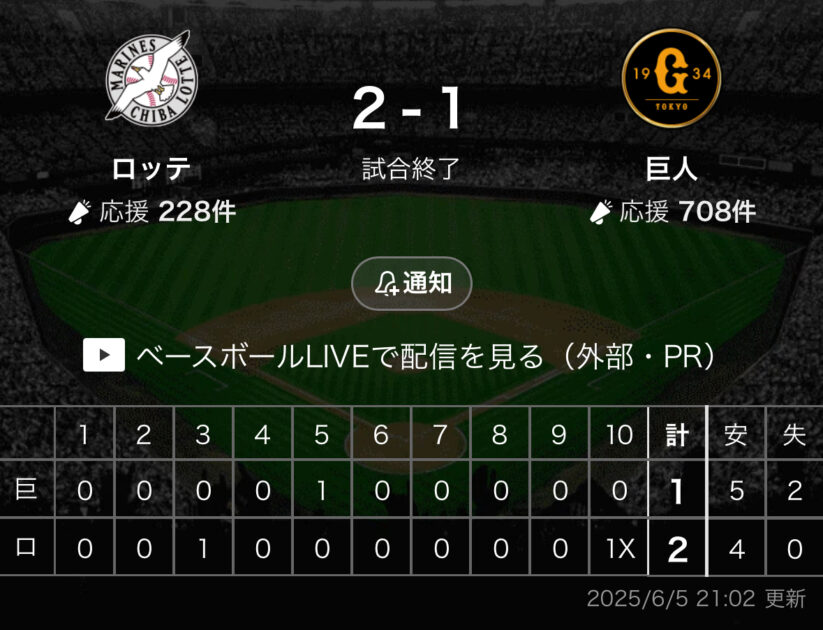 【野球】交流戦 M 2x-1 G [6/5] ロッテ連勝 延長10回に岡 がサヨナラ 巨人4連敗、丸後逸、増田陸FC、大勢押し出し死球