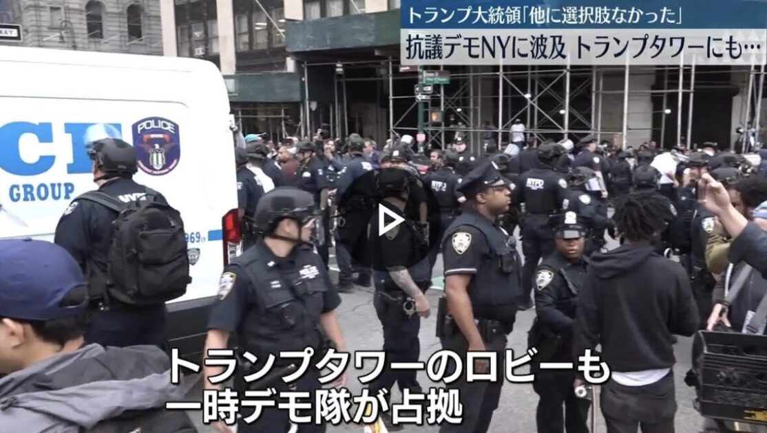 また、マンハッタンのトランプタワーのロビーも一時、デモ隊に占拠されるなど、影響が広がっています。