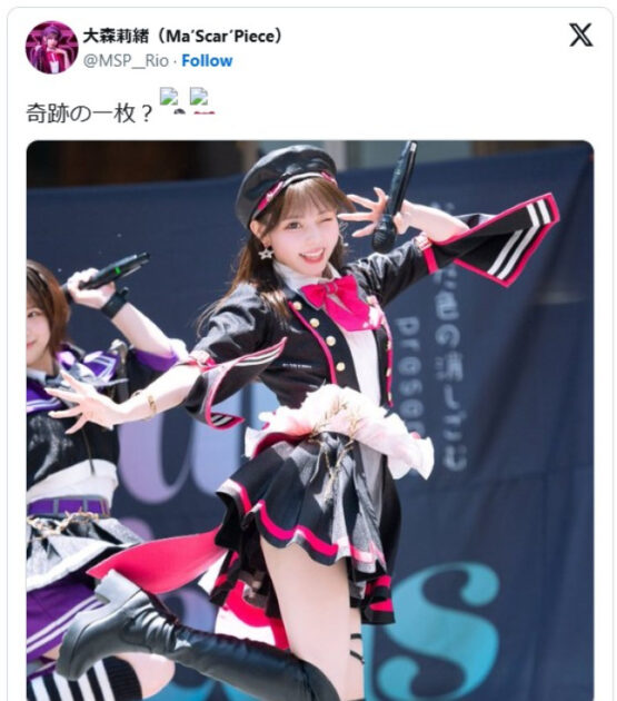元「ラストアイドル」で現在はアイドルグループ「Ma’Scar’Piece(マスカーピース)」の一員として活躍する大森莉緒が10日までにエックスを公開。「奇跡の一枚」と題した写真を投稿すると、自身初の“万バズ”となる反響を集めた。大森が投稿したのは、ライブで踊る自身を収めたショット。ダンス中で片足立ちながらも、ばっちりとカメラに視線を向けウインクをする瞬間を切り取られている。ミニスカートや袖口の揺れも躍動感を演出している。