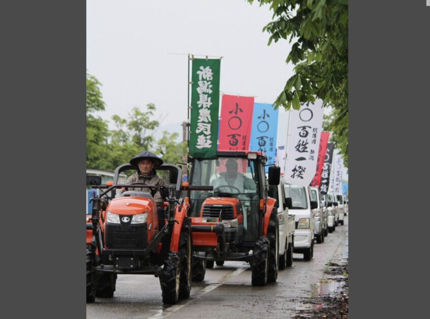 デモは「新潟百姓一揆」と題し、県内の農家らでつくる実行委員会が主催した。200人を超える参加者は長岡市内の公園に集まった後、トラクターを先頭に出発。買い物客でにぎわう商業施設の周囲約1.3キロを、「未来の子どもに国産を残そう」などとシュプレヒコールを上げながら行進した。