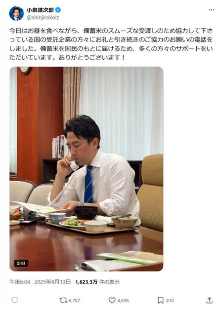 小泉農相は「今日はお昼を食べながら、備蓄米のスムーズな受渡しのため協力して下さっている国の受託企業の方々にお礼と引き続きのご協力のお願いの電話をしました」と動画を公開した。目の前の机に昼食が乗った状態で、小泉農相がにこやかに電話をかける様子を捉えた動画だ。「備蓄米を国民のもとに届けるため、多くの方々のサポートをいただいています。ありがとうございます!」と関係者に感謝を述べている。