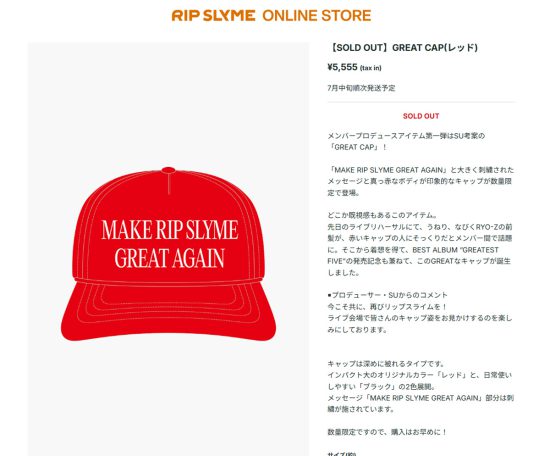 キャップをプロデュースしたのは、メンバーのSU。「今こそ共に、再びリップスライムを!」とファンに呼びかける思いを込めたのだそう。このコメントを見ると、純粋な気持ちの照れ隠しで遊び心を出してしまったぐらいの話なのでしょう。