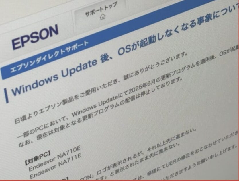 エプソンダイレクトは、6月18日にサポートページを更新し、Windows Update適用後に起動しなくなったPCを修理で対応すると明らかにした。UEFIの修正を行う。 該当するのは、2020年発売のノートPC「Endeavor NA710E」と、その後継機として22年に登場した「Endeavor NA711E」。Windows Update適用後、電源を投入しても「EPSON」ロゴが表示されるが、それ以上先に進まない、あるいは「自動修復を準備しています」と表示されたまま先に進まないといった症状が出ているという。