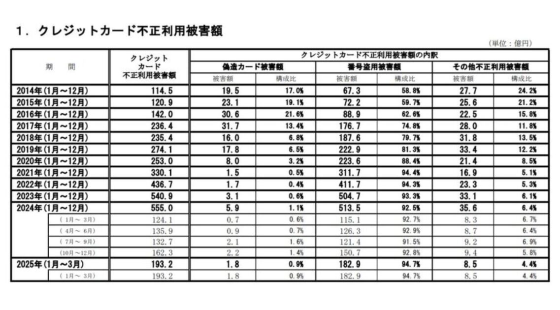 (一社)日本クレジット協会がまとめた、2025年1~3月期の国内のクレジットカードの不正利用被害額は、前年同期比55.7%増の193億2000万円となった。
