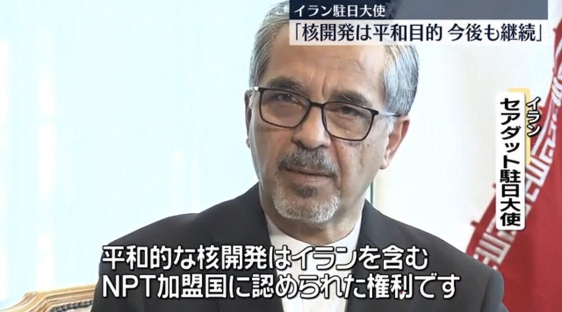 イランのセアダット駐日大使は19日、日本テレビなどのインタビューに応じ、イランの核開発はあくまで平和目的で、今後も続けていくとの認識を強調しました。