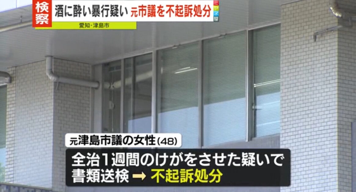 愛知県津島市の病院で、酒に酔って看護師らに暴◯を加えケガをさせたとして書類送検されていた元津島市議会議員の女性が、不起訴処分となりました。共産党に所属する元津島市議会議員の48歳の女性は去年12月、津島市民病院で研修医や看護師ら3人に暴◯を加え、看護師に全治1週間のケガをさせた疑いで今年3月、書類送検されていました。