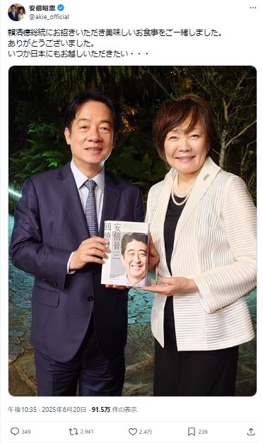 20日夜の投稿に「頼清徳総統にお招きいただき美味しいお食事をご一緒しました。ありがとうございました。いつか日本にもお越しいただきたい・・・」とつづり、安倍氏が亡くなった後に出版された「安倍晋三回顧録」の台湾版を手に、頼総統と並んだ写真をポストした。