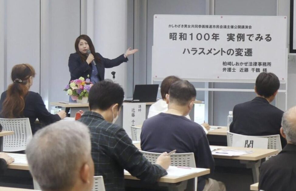 ハラスメントが時々で変わっていくことを学ぶ公開講演会が、柏崎市役所で開かれた。パワハラ、セクハラなど多様化するハラスメントについての実例を聞き、未然防止について考えた。 かしわざき男女共同参画推進市民会議が毎年、時勢に合ったテーマと講師を選んで講演会を開いている。柏崎しおかぜ法律事務所の近藤千鶴弁護士を招き、44人が参加した。