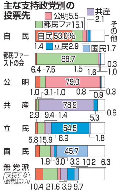 都民ファは支持層の88.7%を固め、公明は79.0%、共産は78.9%、立民は54.5%、国民民主党は45.7%。自民支持層の15.1%は都民ファを投票先に選んだ。