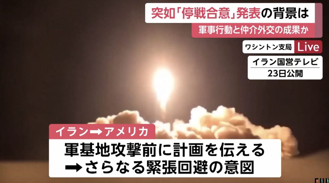 トランプ氏が明らかにした合意内容では、イランが先に攻撃を停止しその12時間後にイスラエルが攻撃を停止するとしていて、成立となればトランプ政権の軍事行動と仲介外交が緊張緩和の出口戦略を作ったといえます。