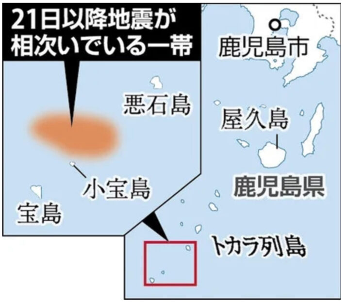 同列島近海では過去にも地震が多発。2021年12月には震度1以上の地震が308回発生。同月9日には、悪石島を最大震度5強の揺れが襲い、島民30人が鹿児島市などに避難した。