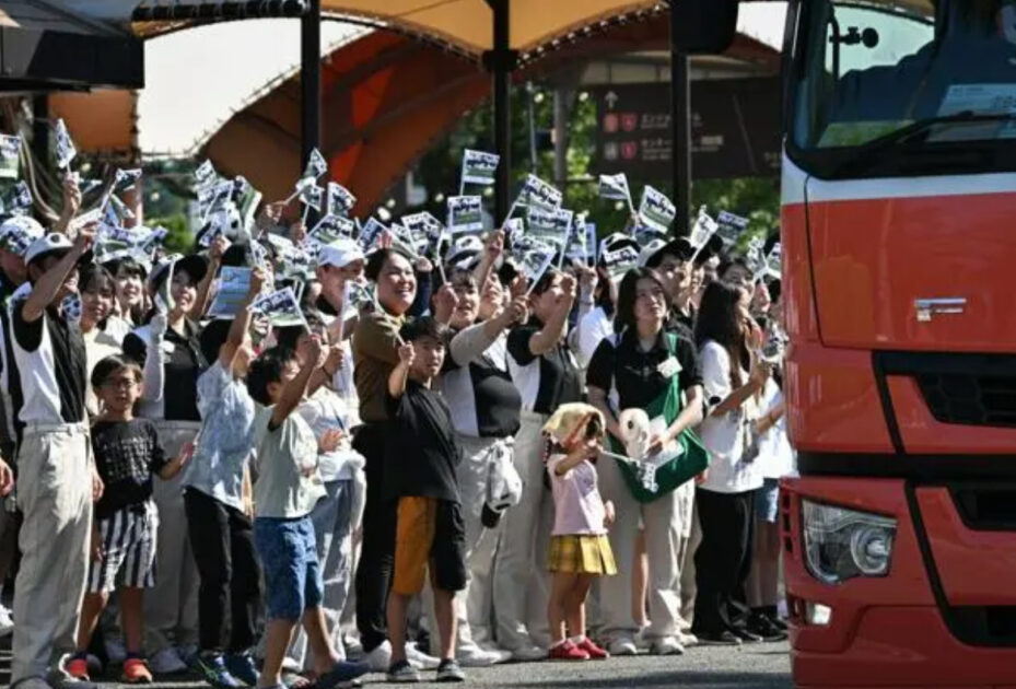 出発するトラックの見送りにはスタッフら約300人が集まり、今津孝二園長が「アドベンチャーワールドの新たな顔を、ゲストの方にお見せできるようがんばりましょう。笑顔でパンダたちを見送ってください」とあいさつした。スタッフの一部は中国まで同行するという。