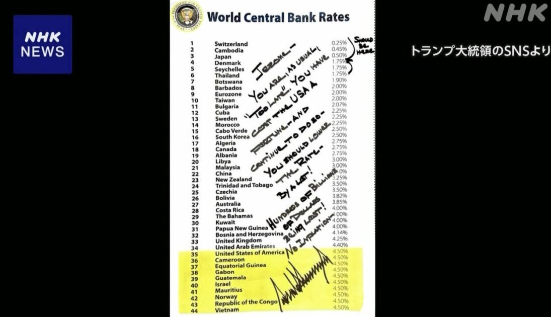 そして各国の中央銀行の政策金利がランキングで示された紙に手書きで「遅すぎる」などと書き込んだパウエル議長宛の書簡をSNSに掲載し、改めて利下げを求めました。
