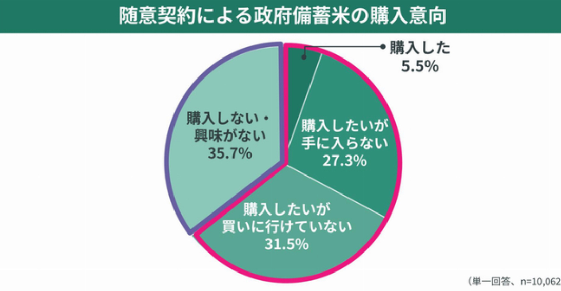 くふうカンパニーHDが運営するくふう生活者総合研究所は、「随意契約による政府備蓄米の購入」に関する調査結果を発表した。生活者10,062人が回答している。なお「政府備蓄米」は、すべて2025年5月末より販売開始した随意契約による政府備蓄米を表す。