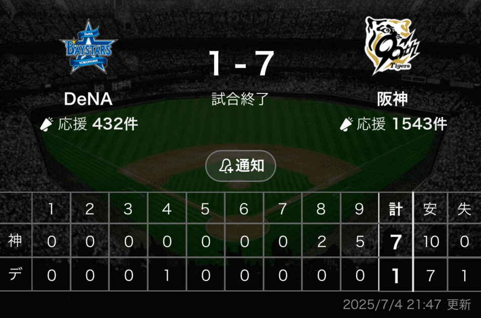 引用元: ・【野球】セ・リーグ DB 1-7 T [7/4] 阪神終盤に逆転6連勝 近本3安打2打点、村上7回1失点 DeNAリリーフ陣炎上 [鉄チーズ烏★]