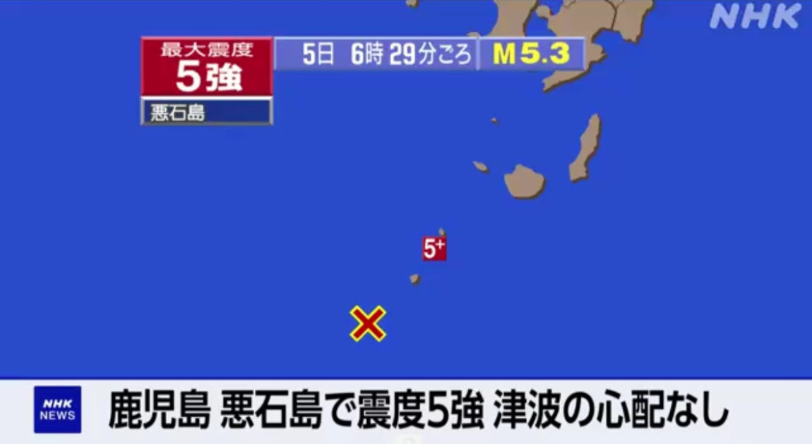 【地震速報】鹿児島 悪石島で震度5強 津波の心配なし(06:29) | NHK | 地震