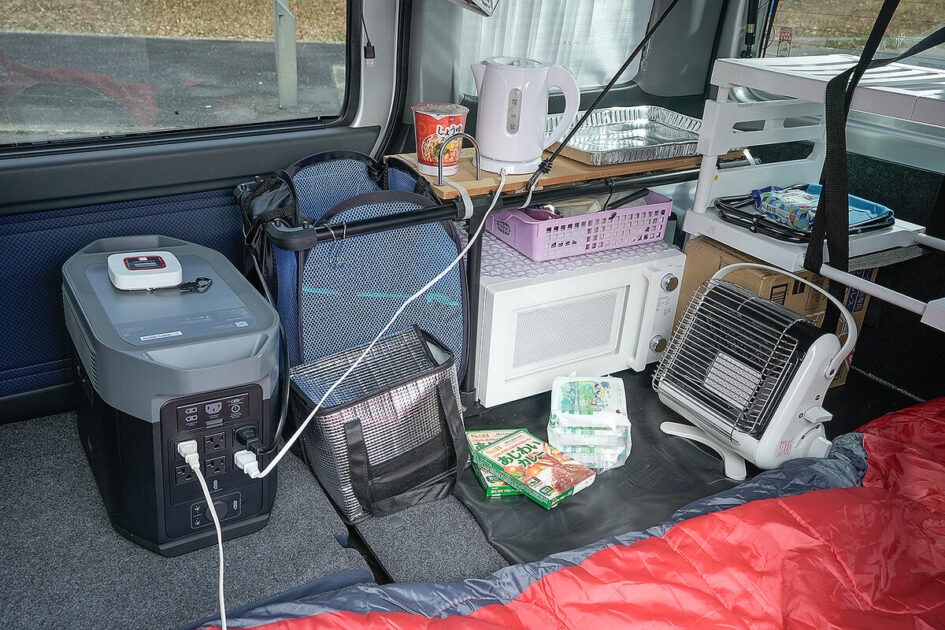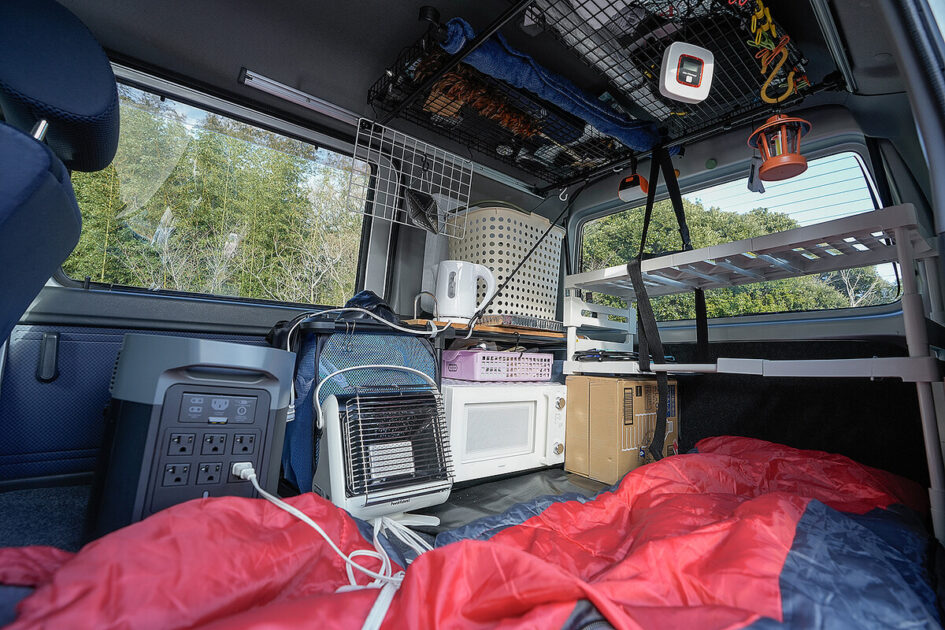 駐車中にエンジンをかけるのはNGですから、クルマの冷暖房機能は使えません。寒さ暑さに対応する手段は限られます。ポータブル電源などを用意して、冬場であれば電気毛布、夏場は扇風機などを稼働するくらいしかないのが現実でしょう。