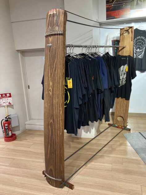 東京・渋谷にあるCDショップチェーン『タワーレコード』で悲鳴を上げたとしてアップしたのは、店内に設置されていたとみられるハンガーラックの写真。店内で販売しているTシャツが吊るされているそれは、琴をリメイクして作られたものだった。
