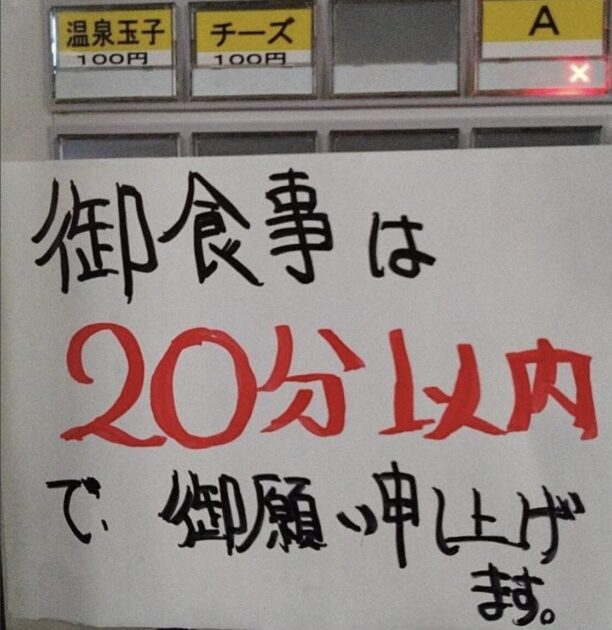 最近、極端にゆっくり食べている方が増えまして、ロット乱れたりお店としても困っています。お食事は「最大」で20分以内にお願いします。