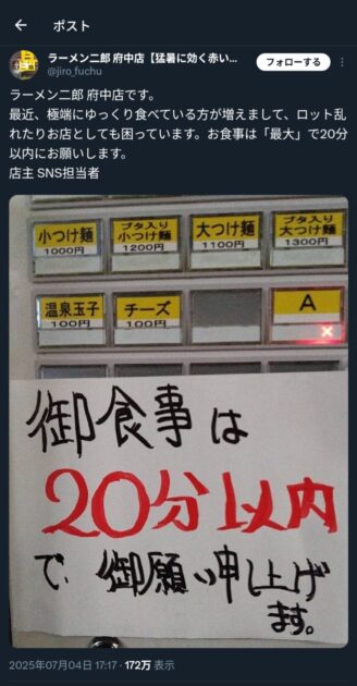店主 SNS担当者ラーメン二郎府中店、食事は「20分以内で」と“異例”のお願い「お店としても困っています」