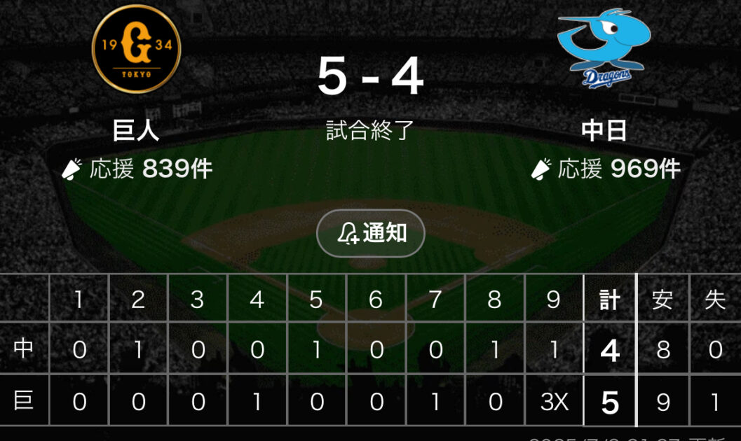 巨人 0 0 0 1 0 0 1 0 3x |5