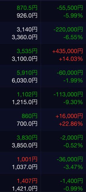 Xでは「3と6月に優待目的で買った銘柄含み損減らないなぁ 1年後には真っ赤に染まるの期待して待ってみる」と保有株の画像を投稿。+43万5000円の銘柄もあれば、-33万1000円、-22万円のものもあり、多くが含み損となっている。