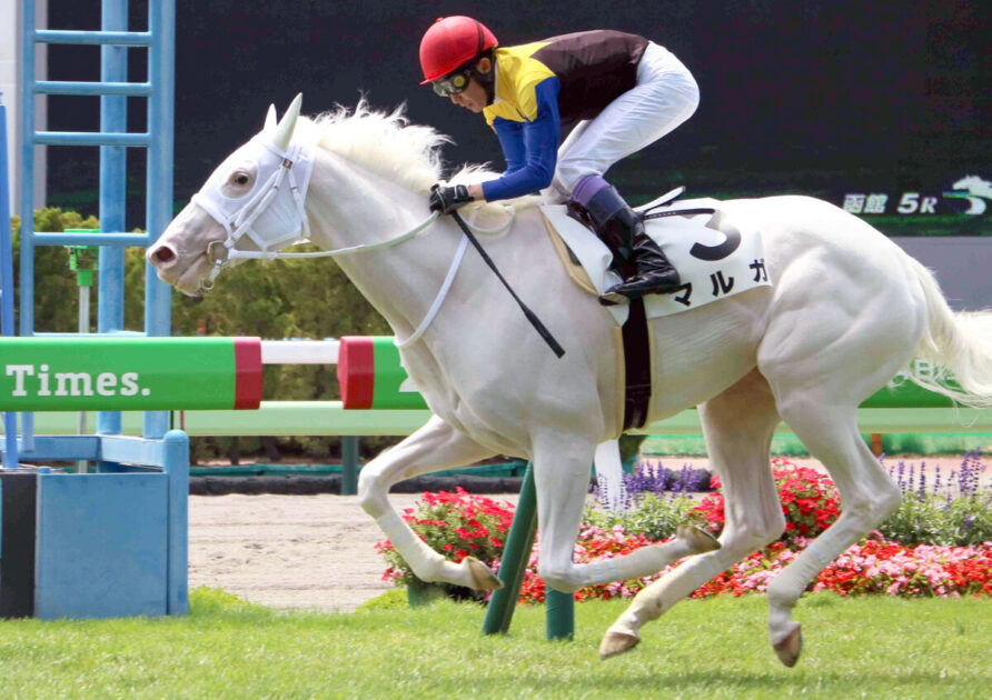 7月12日の函館5R・2歳新馬(芝1800メートル=7頭立て)は、G1・3勝を挙げたソダシの半妹で、同じ白毛のマルガ(牝、栗東・須貝尚介厩舎、父モーリス)が単勝1・1倍の圧倒的人気に応えて勝利した。勝ち時計は1分48秒1(良)の2歳コースレコード。 ゲートを出ると、スッと重心を下げて先手を主張。すんなりとハナに立ち、前半1000メートル通過が60秒4のスローペースに落として先頭で快調なリズムを刻んだ。3コーナーで外からサントルドパリ(2着)が早めの仕掛けで競りかけてきたが、慌てず、力むことなく直線へ。武豊騎手がゴーサインを出すと、四肢をいっぱいに伸ばして力強く加速。上がり最速タイの35秒7の末脚で2着に3馬身差をつけ、2018年にウィクトーリアが記録した1分48秒3を0秒2更新し、2歳コースレコードを樹立した。